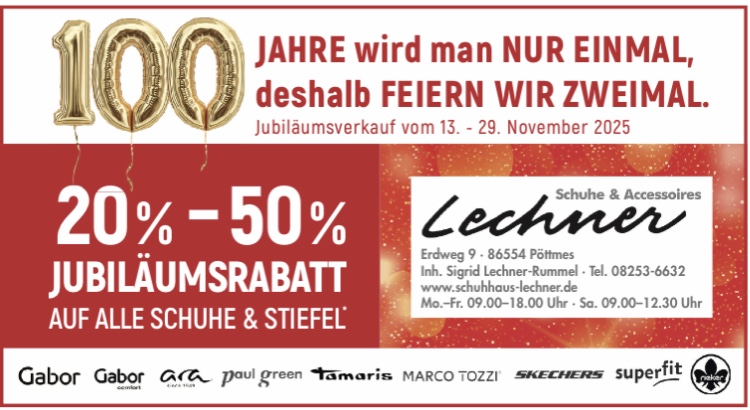 Ein Jahrhundert besteht man nicht zufällig. Seit 1925 steht Schuhhaus Lechner in Pöttmes für persönliche Beratung, Qualität und eine sorgfältige Auswahl an Schuhen für Damen, Herren und Kinder. 100 Jahre sind ein besonderer Meilenstein – und genau deshalb feiern wir nicht nur einmal, sondern gleich zweimal.