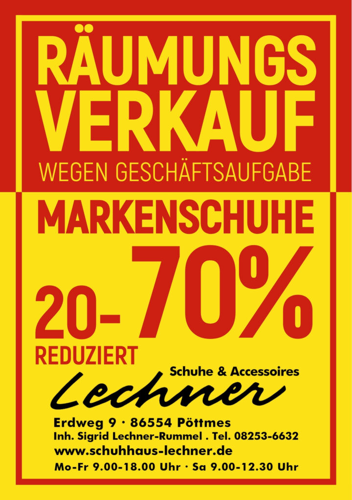 Es ist ein besonderer Moment für das Schuhhaus Lechner in Pöttmes: Nach vielen erfolgreichen Jahren im stationären Einzelhandel beginnt ein großer Räumungsverkauf. Für unsere Kundinnen und Kunden bedeutet das vor allem eines – hochwertige Markenschuhe zu außergewöhnlich günstigen Preisen.